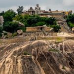 The Colossus of Lord Gommateshwara stands on Vindhyagiri. The steps lead through two decorative stone-arches and past the first small shrine and the arch as one ascends, they have a panoramic view of the village below with its fine temples, sacred lake and graceful palm.